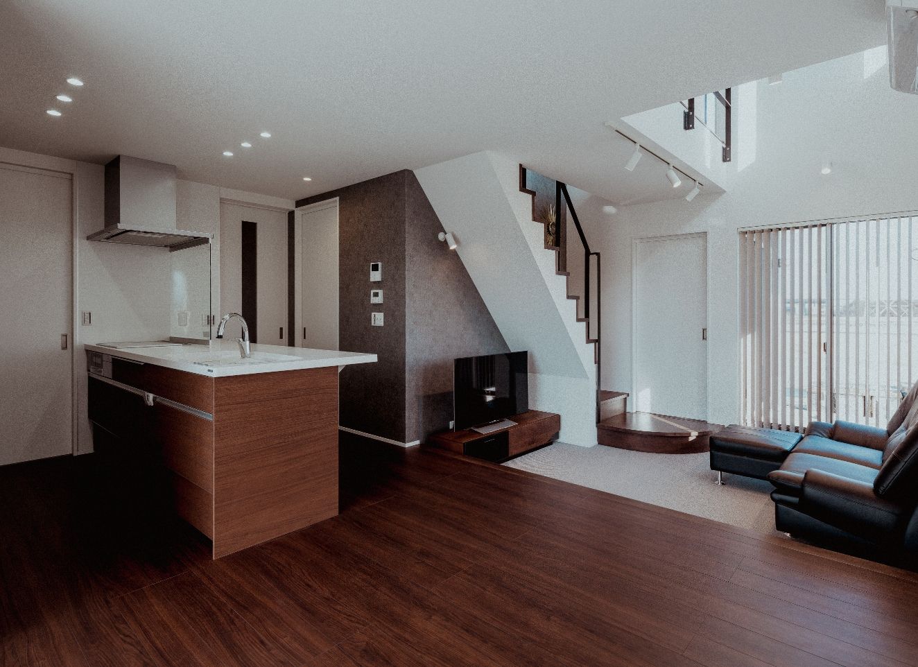LDKに設けた大胆な吹き抜け、複数の窓、白い壁など、日の光を多く取り込む明るく開放的な住宅。奥まで広がるLDKの一画を1段下げることで、区切られたスペースを演出。