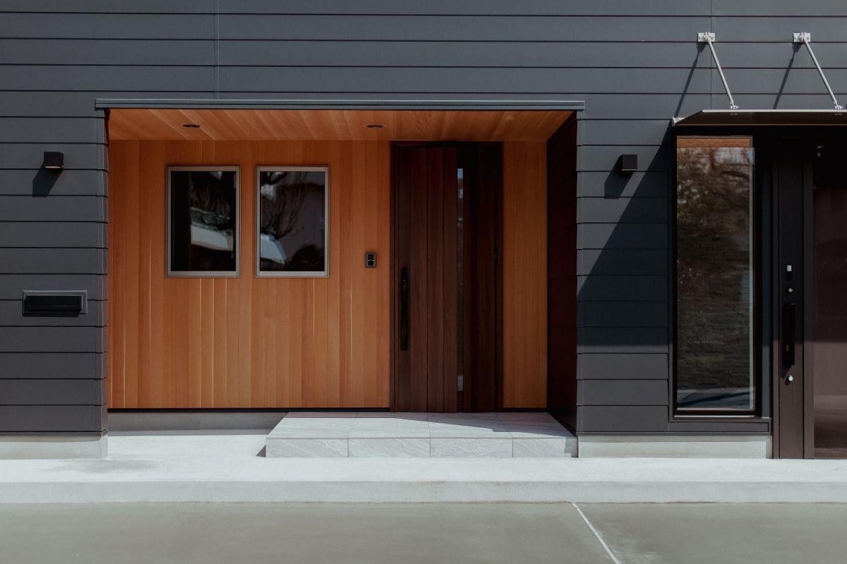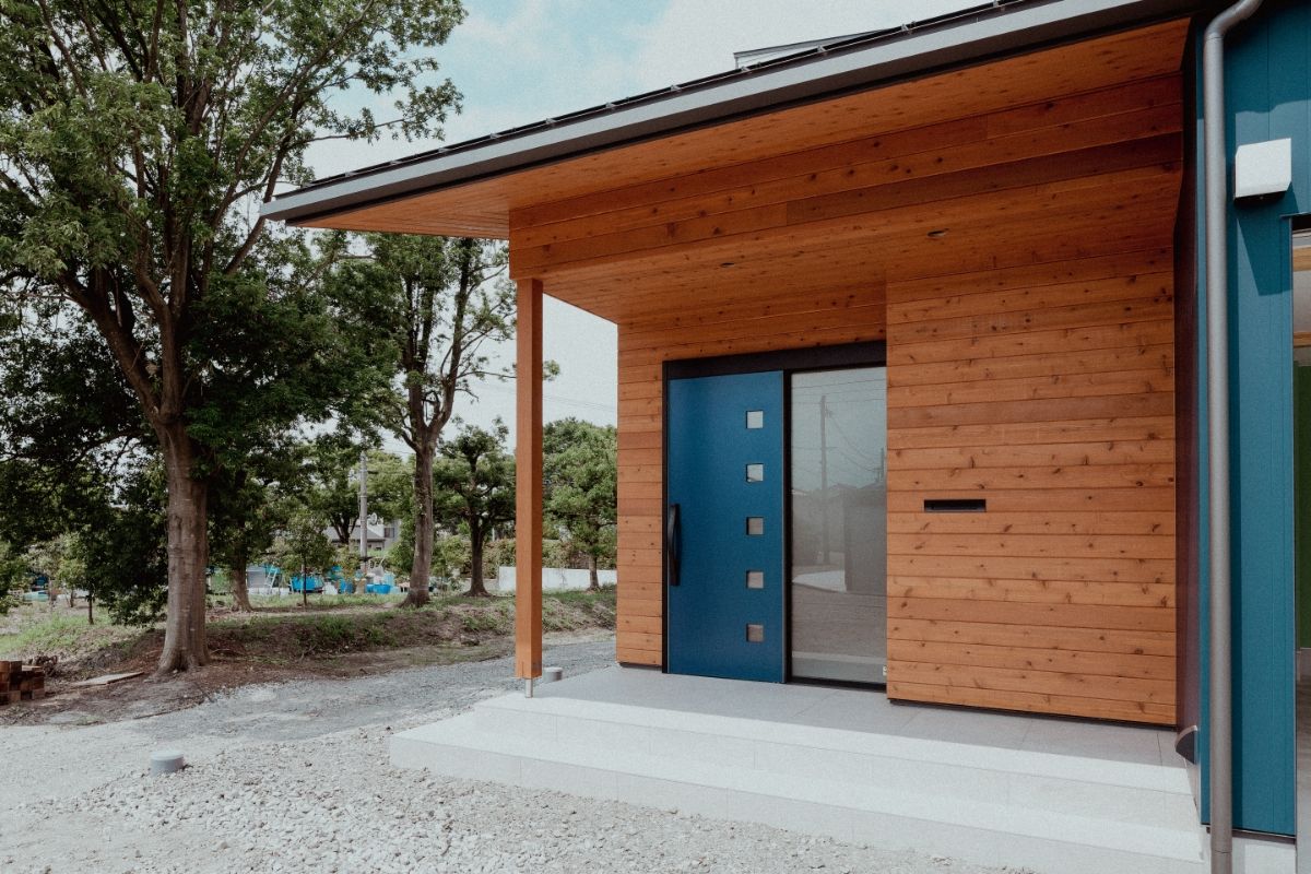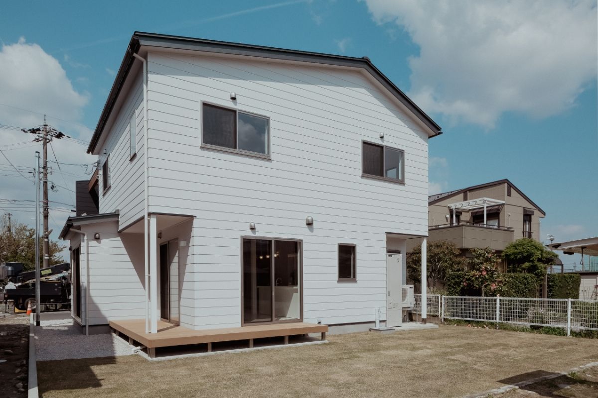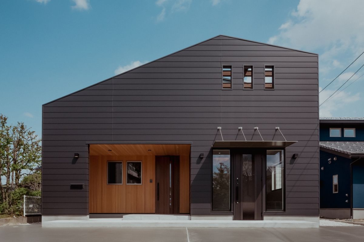 愛犬と遊べる広い芝生の庭がある、事務所併用住宅です。外壁には断熱材入りアルミサイディングを使用し、エントランスには無節無垢のピーラー材を使用しています。美しい外観がとても目をひきます。