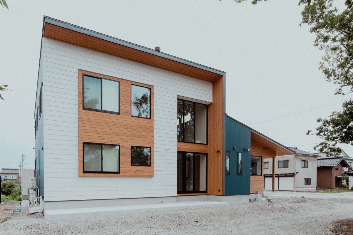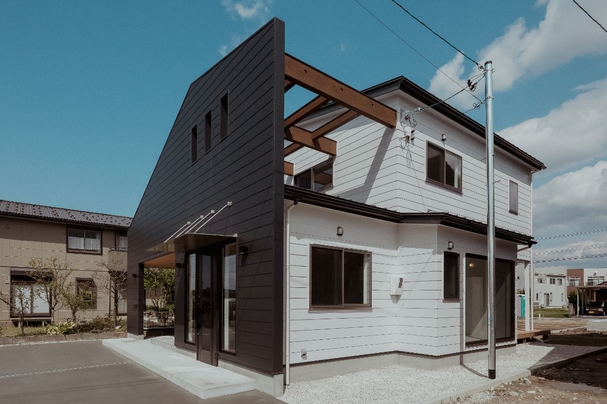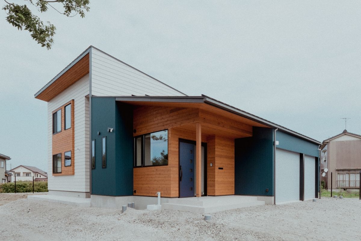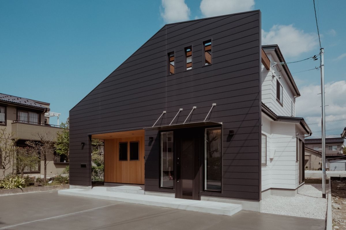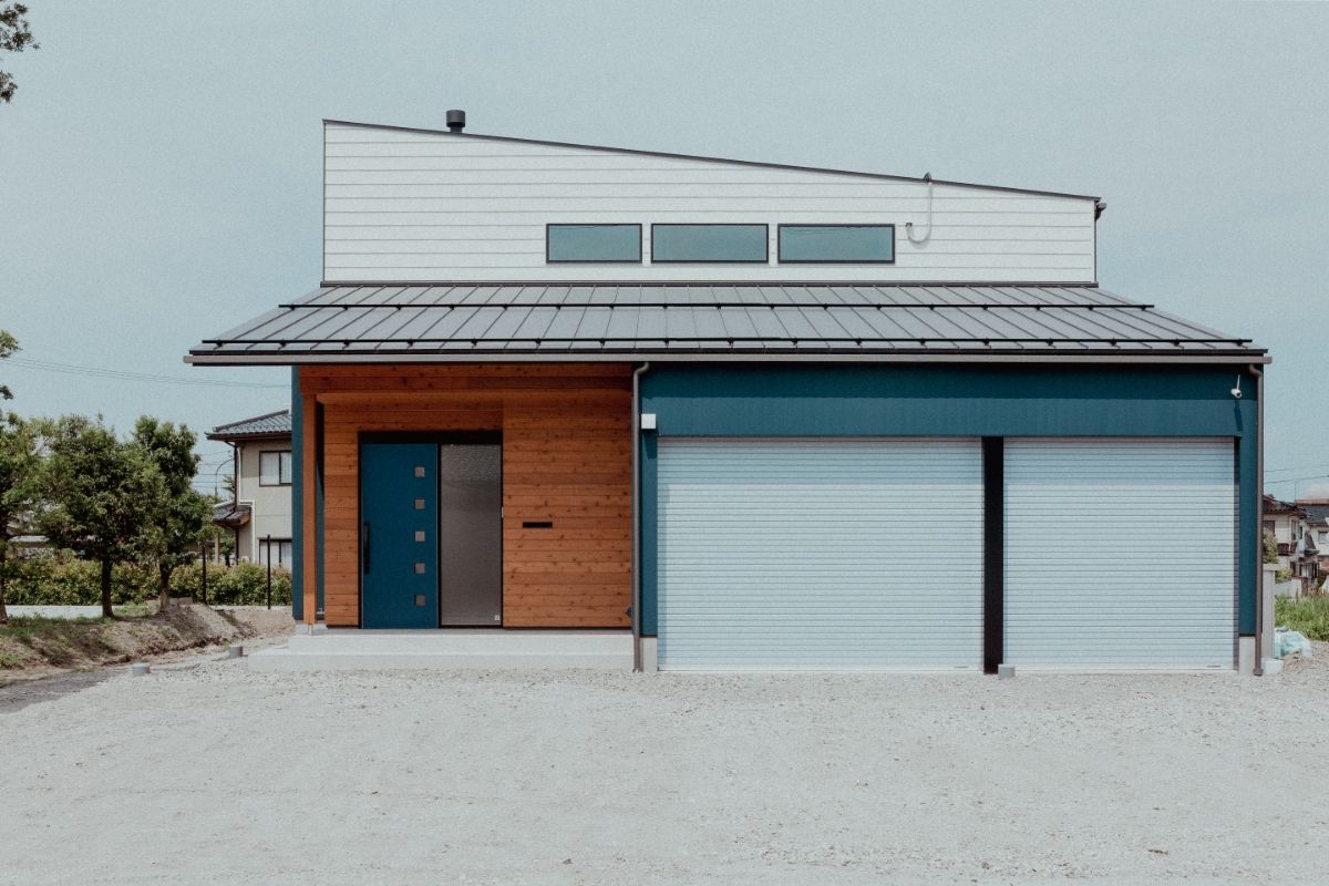 愛犬と遊べる広い芝生の庭がある、事務所併用住宅です。外壁には断熱材入りアルミサイディングを使用し、エントランスには無節無垢のピーラー材を使用しています。美しい外観がとても目をひきます。
