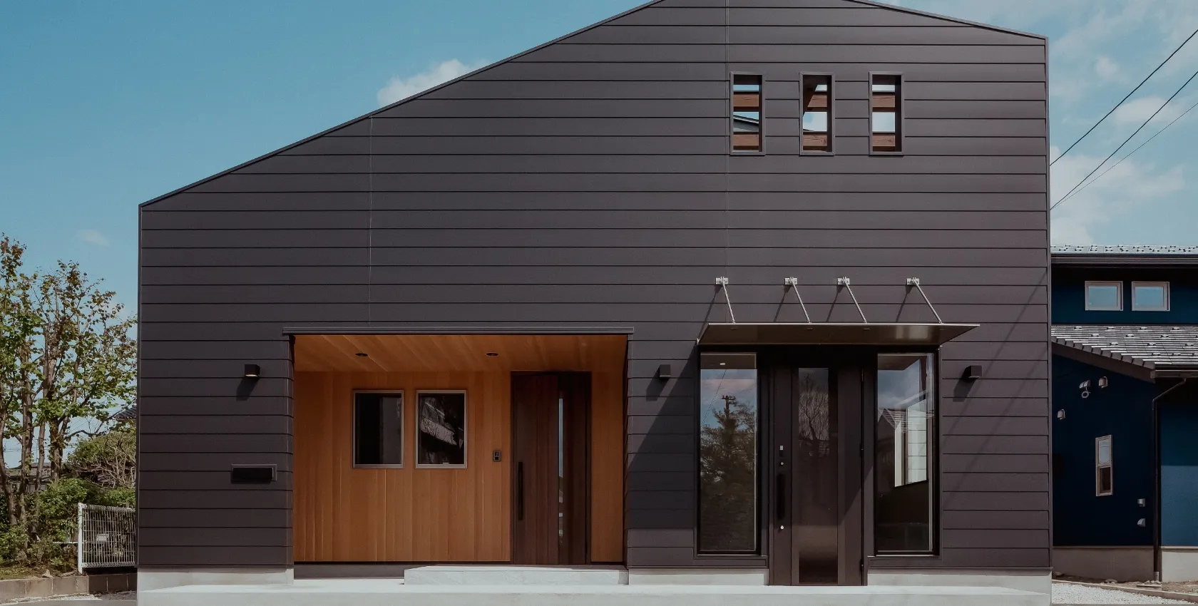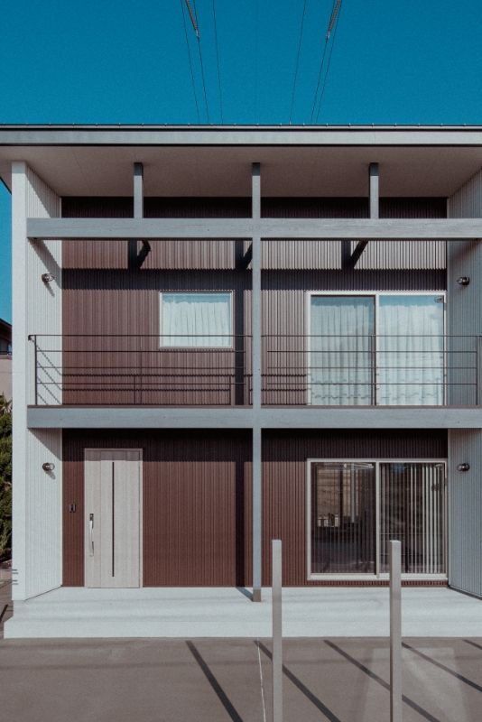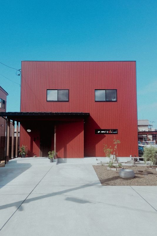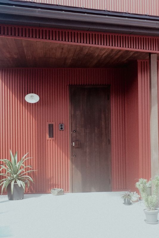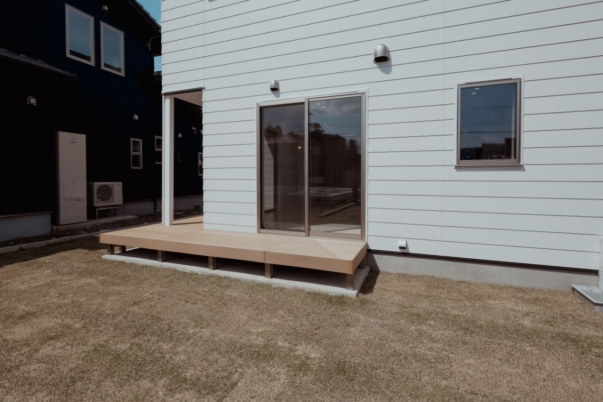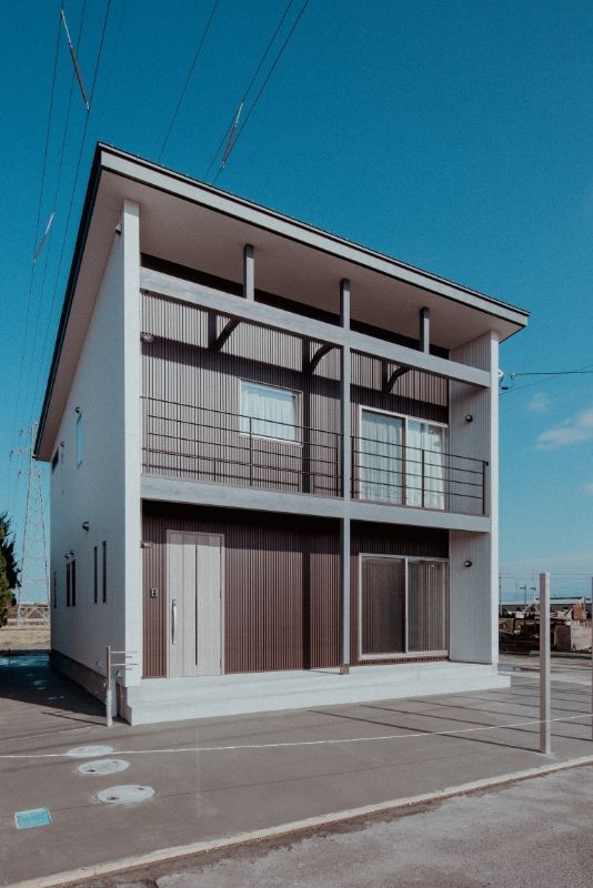 愛犬と遊べる広い芝生の庭がある、事務所併用住宅です。外壁には断熱材入りアルミサイディングを使用し、エントランスには無節無垢のピーラー材を使用しています。美しい外観がとても目をひきます。