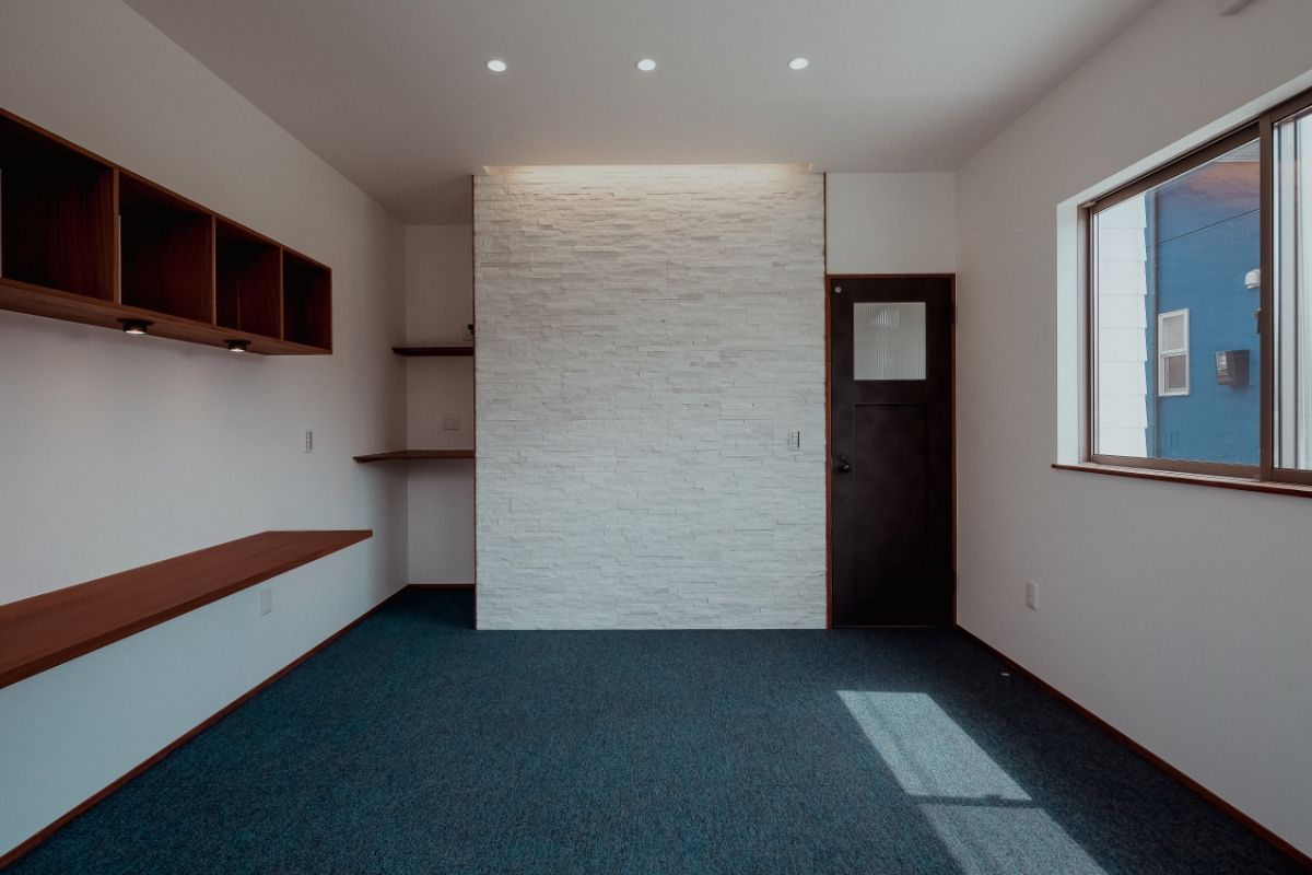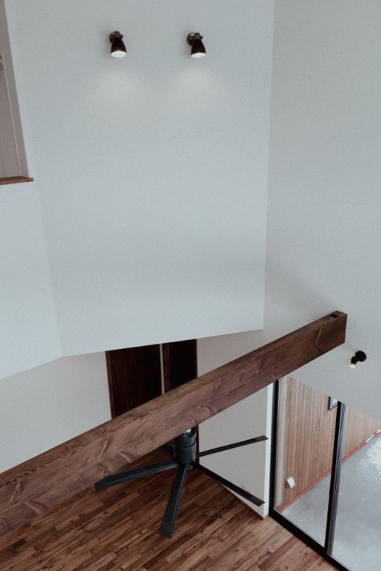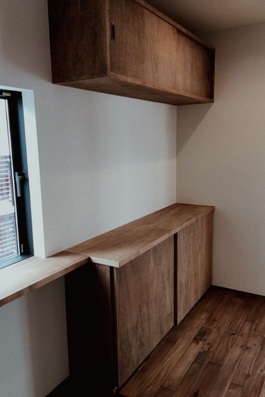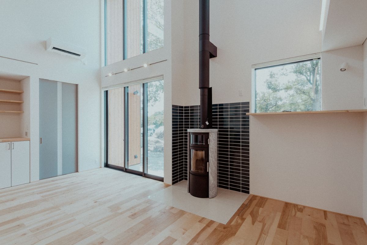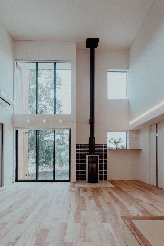 大工と設計士の考える、”家造り”をすべて造作で叶えた、こだわりの事務所併用住宅です。リビングには暖炉を設置。暖をとる楽しさや自然素材のあたたかみを感じられる家を目指しました。