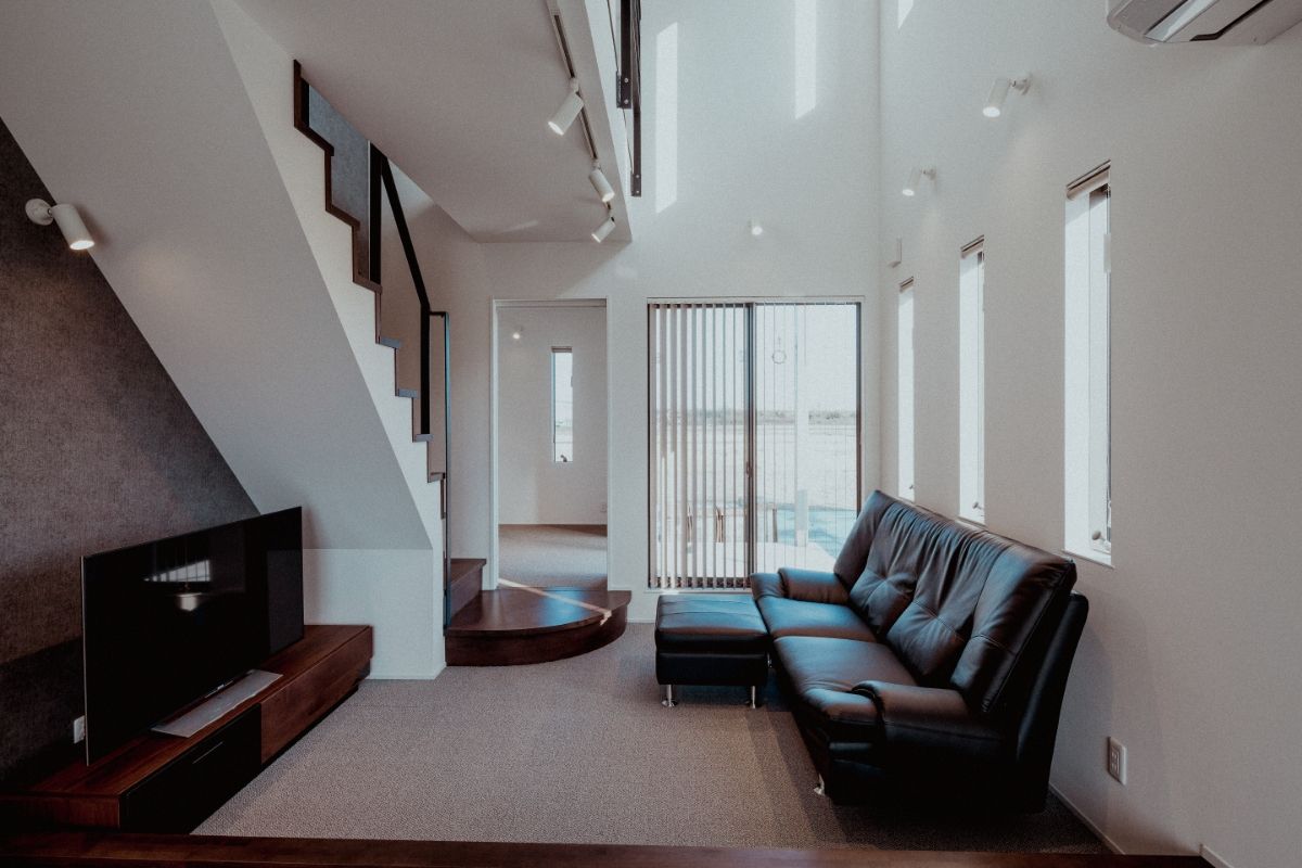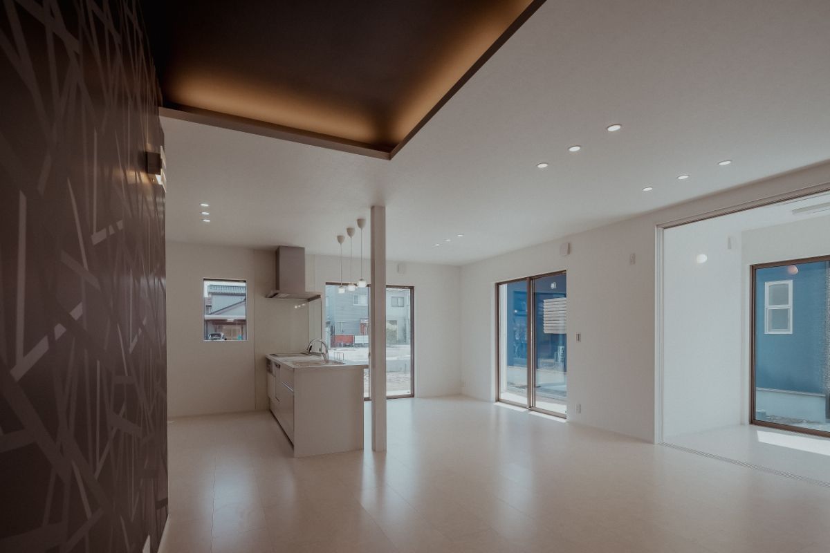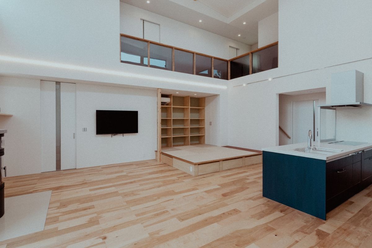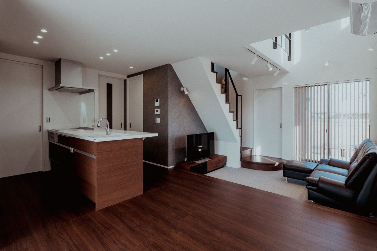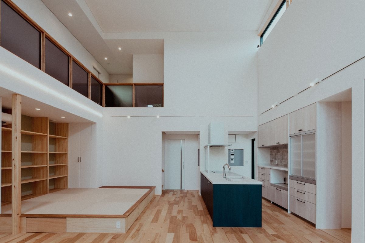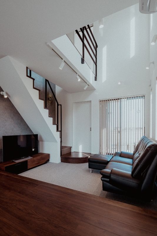 LDKに設けた大胆な吹き抜け、複数の窓、白い壁など、日の光を多く取り込む明るく開放的な住宅。奥まで広がるLDKの一画を1段下げることで、区切られたスペースを演出。
