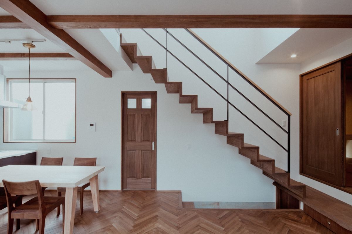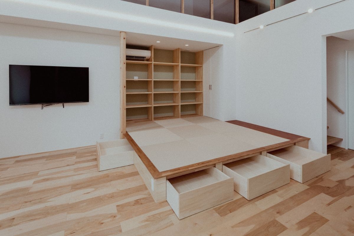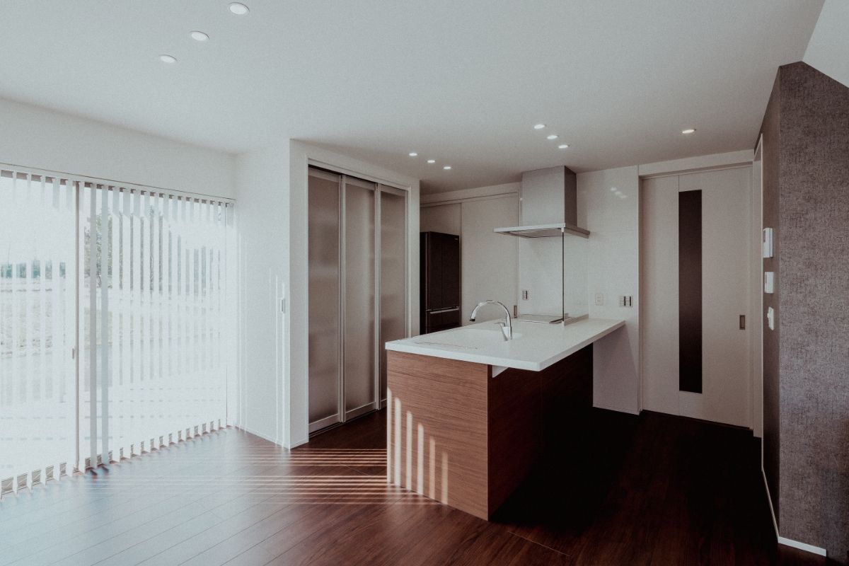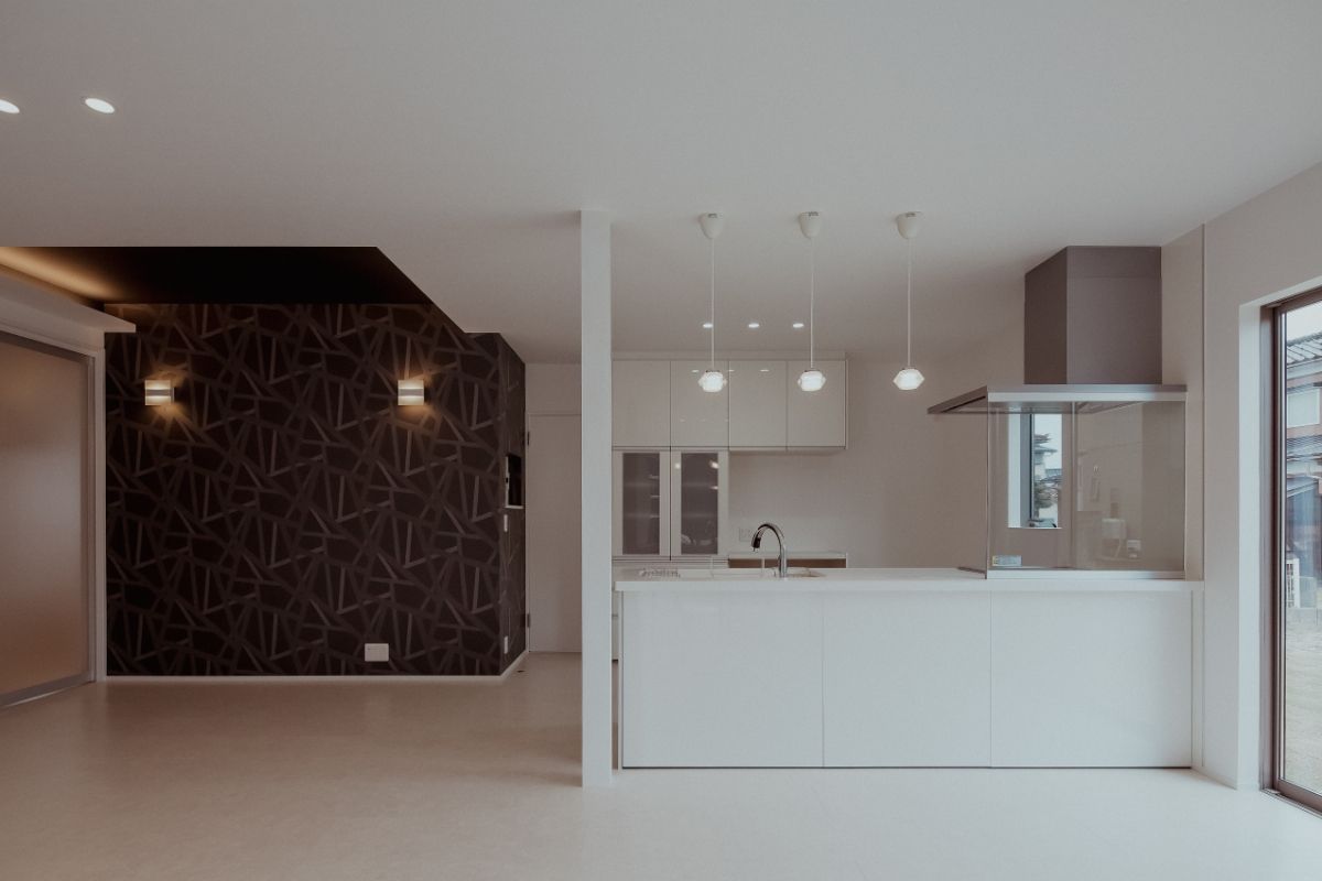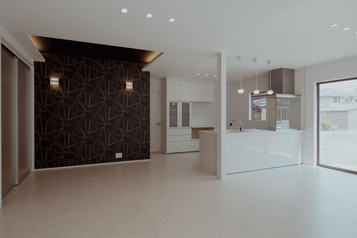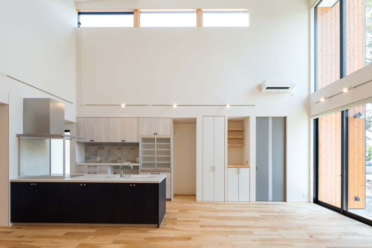 LDKに設けた大胆な吹き抜け、複数の窓、白い壁など、日の光を多く取り込む明るく開放的な住宅。奥まで広がるLDKの一画を1段下げることで、区切られたスペースを演出。