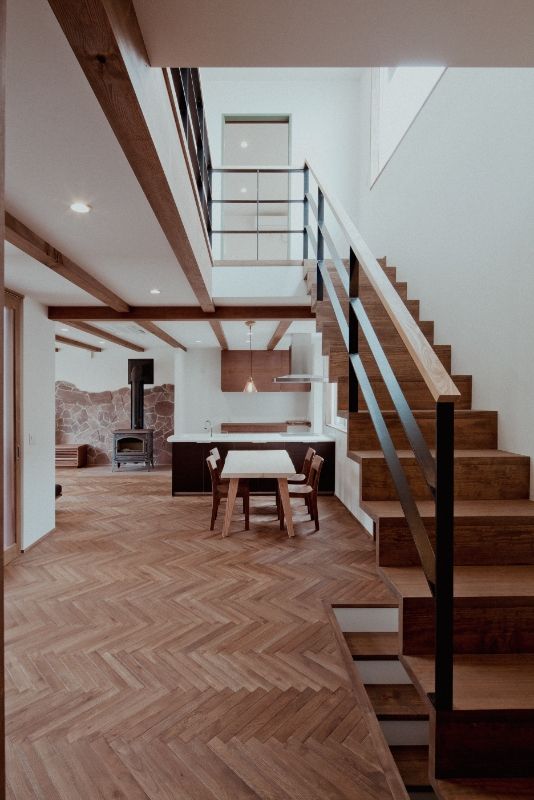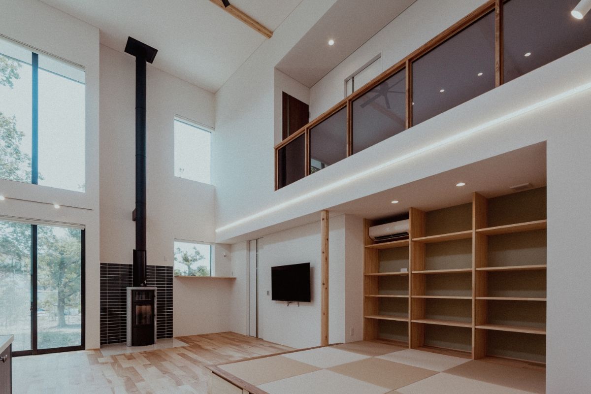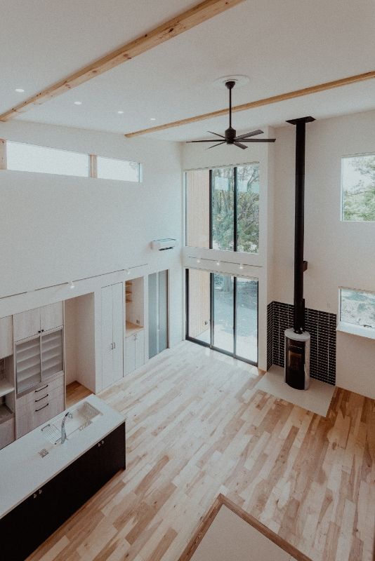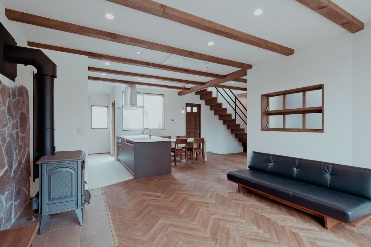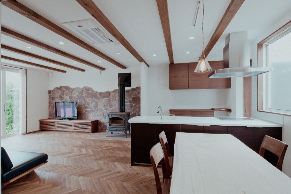 開放感のあるLDK に薪ストーブを設置し、 畳み敷の小上がりもあり小さい子供も安心して遊べる設計。